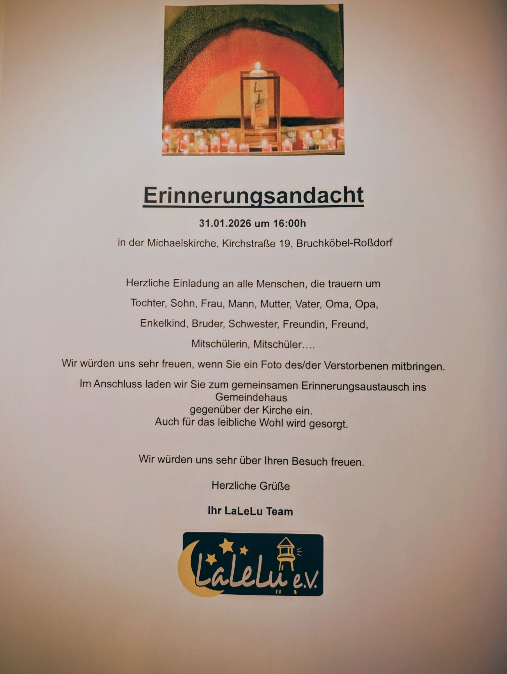 Erinnerungsandacht 31.01.2026 um 16:00h in der Michaelskirche, Kirchstraße 19, Bruchköbel-Roßdorf Herzliche Einladung an alle Menschen, die trauern um Tochter, Sohn, Frau, Mann, Mutter, Vater, Oma, Opa, Enkelkind, Bruder, Schwester, Freundin, Freund, Mitschülerin, Mitschüler…. Wir würden uns sehr freuen, wenn Sie ein Foto des/der Verstorbenen mitbringen. Im Anschluss laden wir Sie zum gemeinsamen Erinnerungsaustausch ins Gemeindehaus gegenüber der Kirche ein. Auch für das leibliche Wohl wird gesorgt. Wir würden uns sehr über Ihren Besuch freuen. Herzliche Grüße Ihr LaLeLu Team