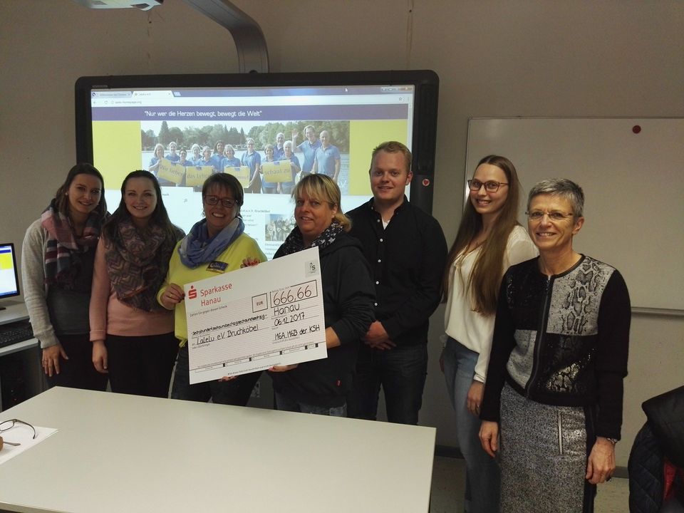 Die angehenden Industriekaufleute des Jahrgangs 2016 der Kaufmännischen Schulen Hanau haben sich spontan entschlossen, zu viel angespartes Geld für ihre Studienfahrt nach Köln, die im Oktober 2017 stattfand, an eine gemeinnützige Organisation zu spenden. Ihre Wahl fiel auf unseren Verein. Am 22.12.2017 wurden Heike Heil und Ellen Sauer in die Schule eingeladen, um den Scheck in Empfang zu nehmen. Die Schulleiterin der Kaufmännischen Schulen, Frau Claudia Galetzka, begrüßte die beiden Gäste und lobte die Auszubildenden für diese tolle Idee. Die Klassensprecherinnen und Klassensprecher Annika Frank, Katharina Fork, Laura Wietzel und Björn Müller-Thurau übergaben im Namen ihrer Mitschüler den Scheck in Höhe von 666,66 Euro an Heike Heil, die sich herzlich für das soziale Engagement der Auszubildenden bedankte und anschließend in kleinen Anekdoten von unseren zahlreichen Aufgaben erzählte.