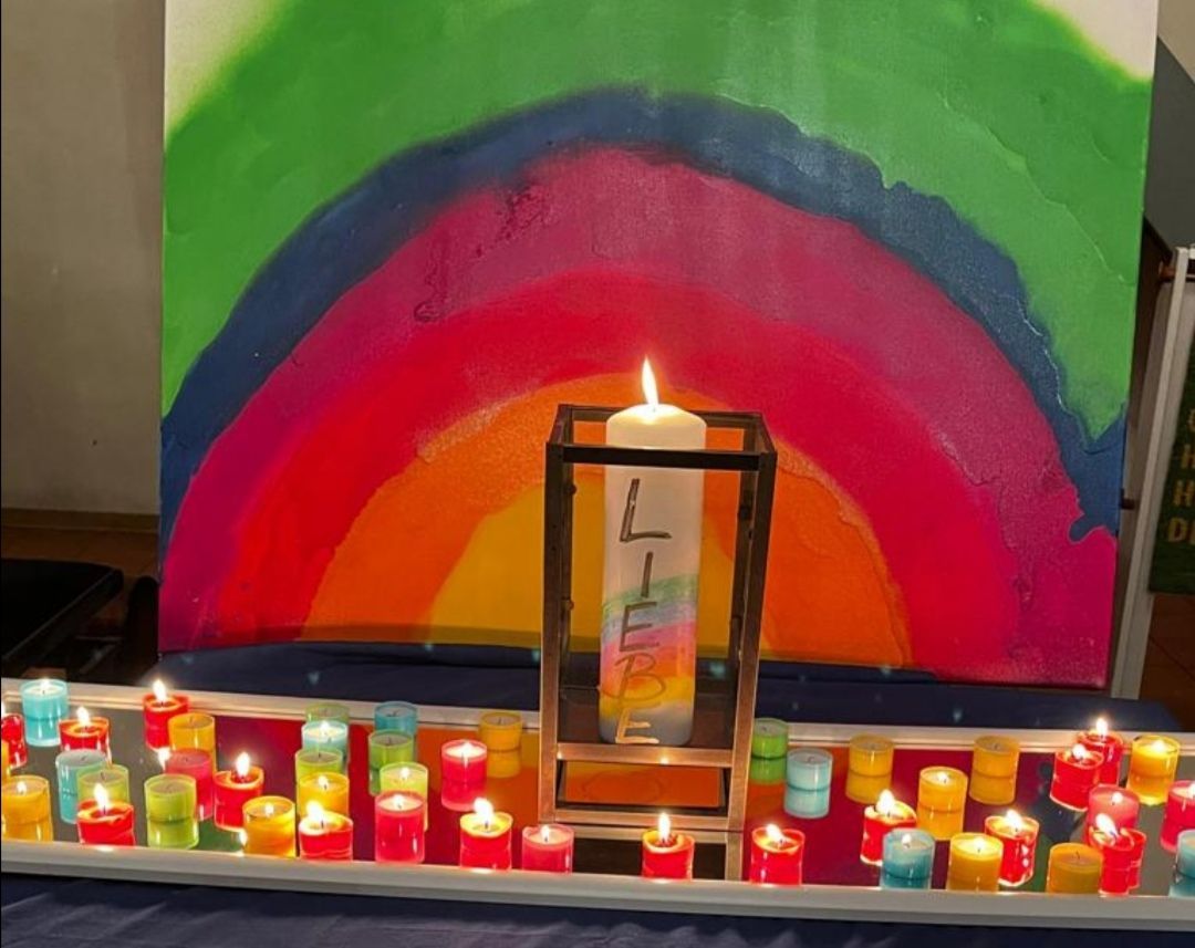 Vor dem gemalten Bild eines Regenbogens konnten alle Anwesenden kleine Lichter zum Gedenken anzünden. Die Musik, die Worte, das Licht und die Farben erstrahlten in wunderschöner Harmonie.