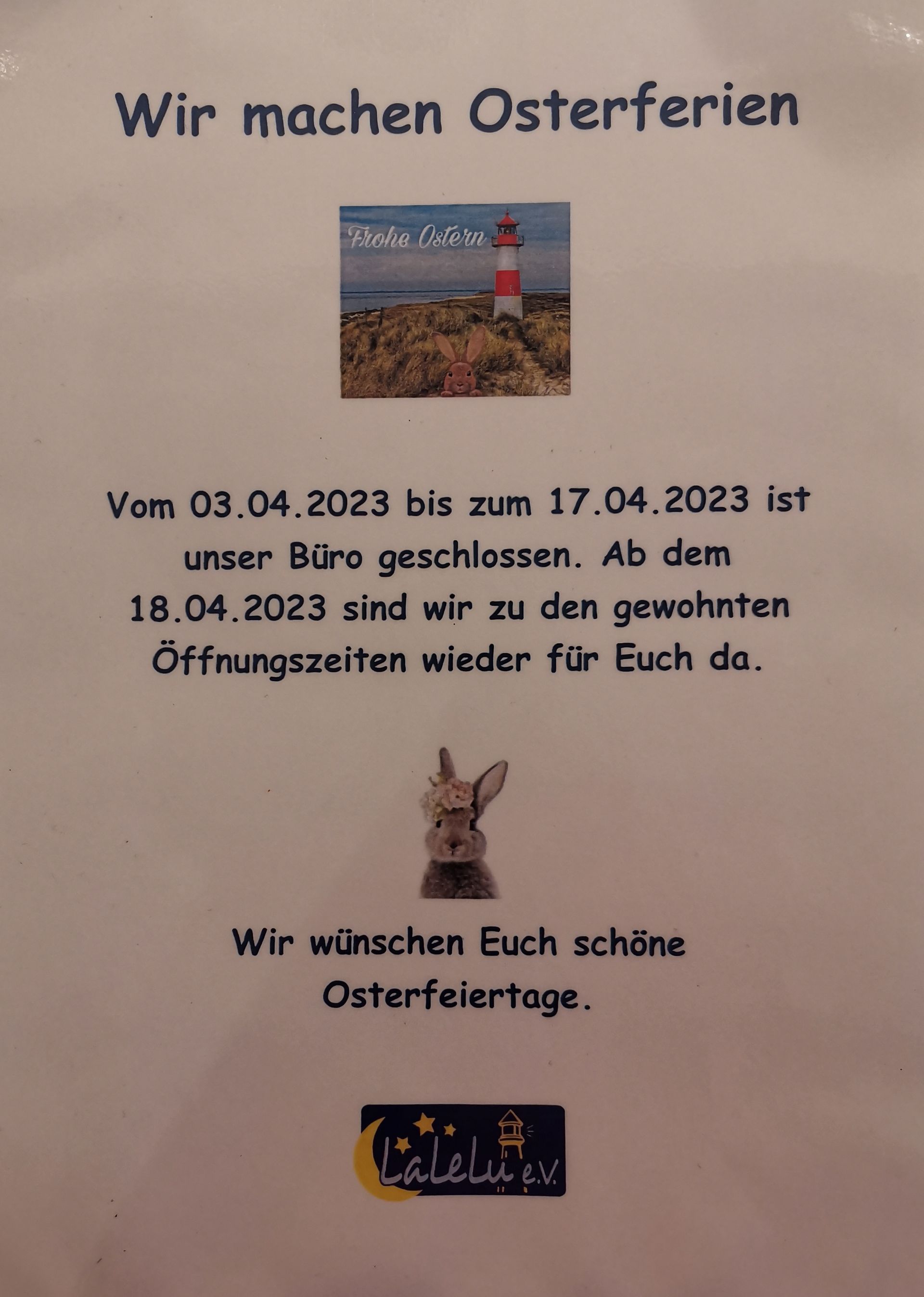 Wir machen Osterferien. Aus diesem Grund ist unser Büro vom 03.04. bis zum 17.04.2023 geschlossen. Am 18.04.2023 sind wir zu den gewohnten Öffnungszeiten wieder für euch da. Wir wünschen euch auf diesem Weg schöne Feiertage und ganz tolle Ferien.